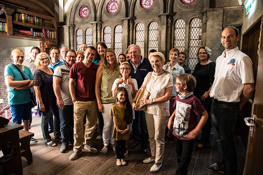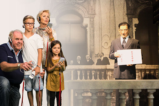 A happy group of tourists in the introduction room